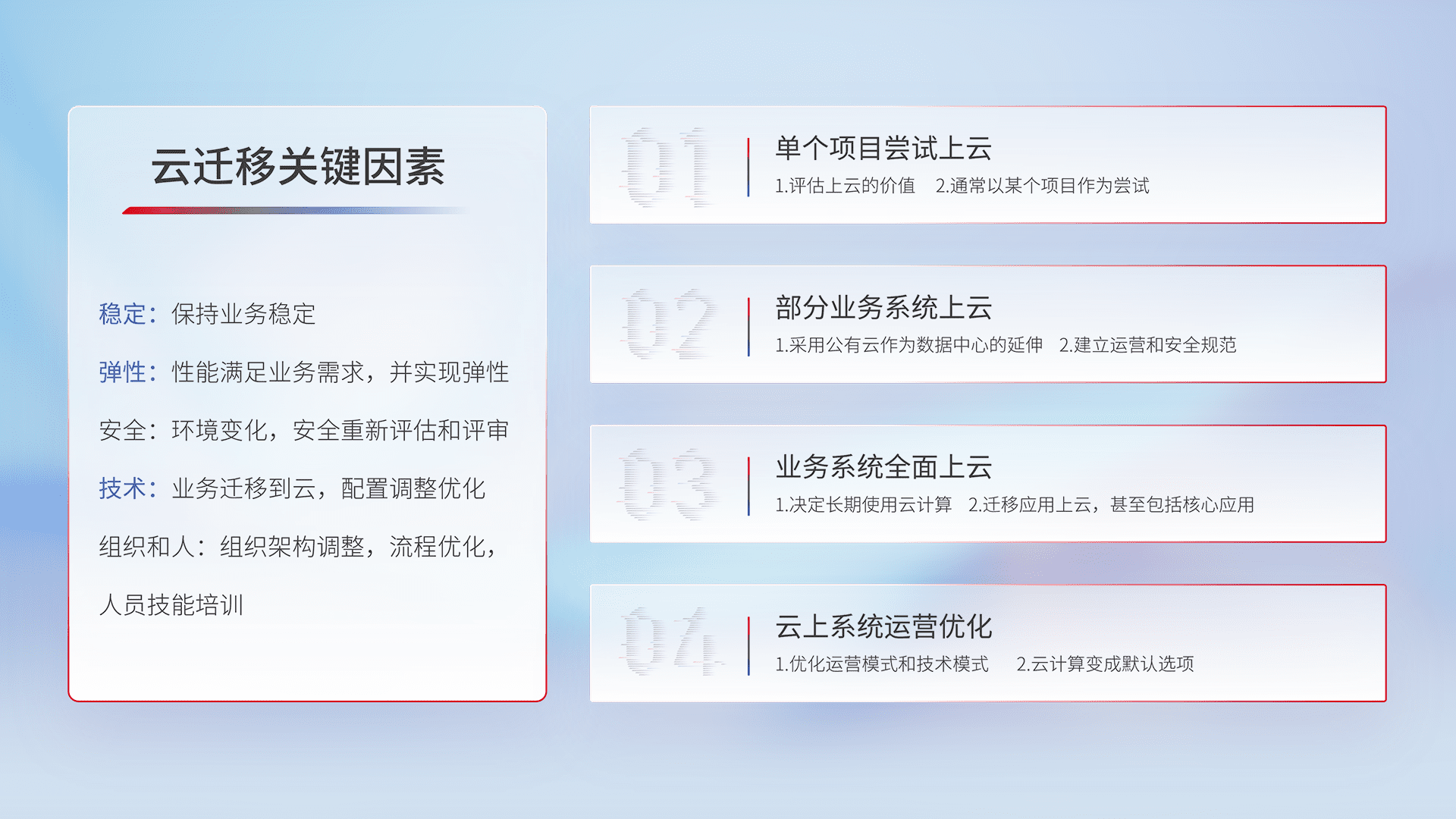 结合实际业务,,,,从规划设计、、、云平台选型、、、、云原生改造、、、数据迁移、、、集成交付,,迁移全过程为客户识别最佳上云路径,,做好风险识别管理,,,,设计网络架构、、身份权限、、安全审计合规、、、、操作审计、、、、日志审计、、、、监控告警策略、、多站点容灾设计等,,,,对云上基础设施进行整体规划,,,,提升IT治理水平,,,,以满足弹性、、、高可用、、高性能的需求。。