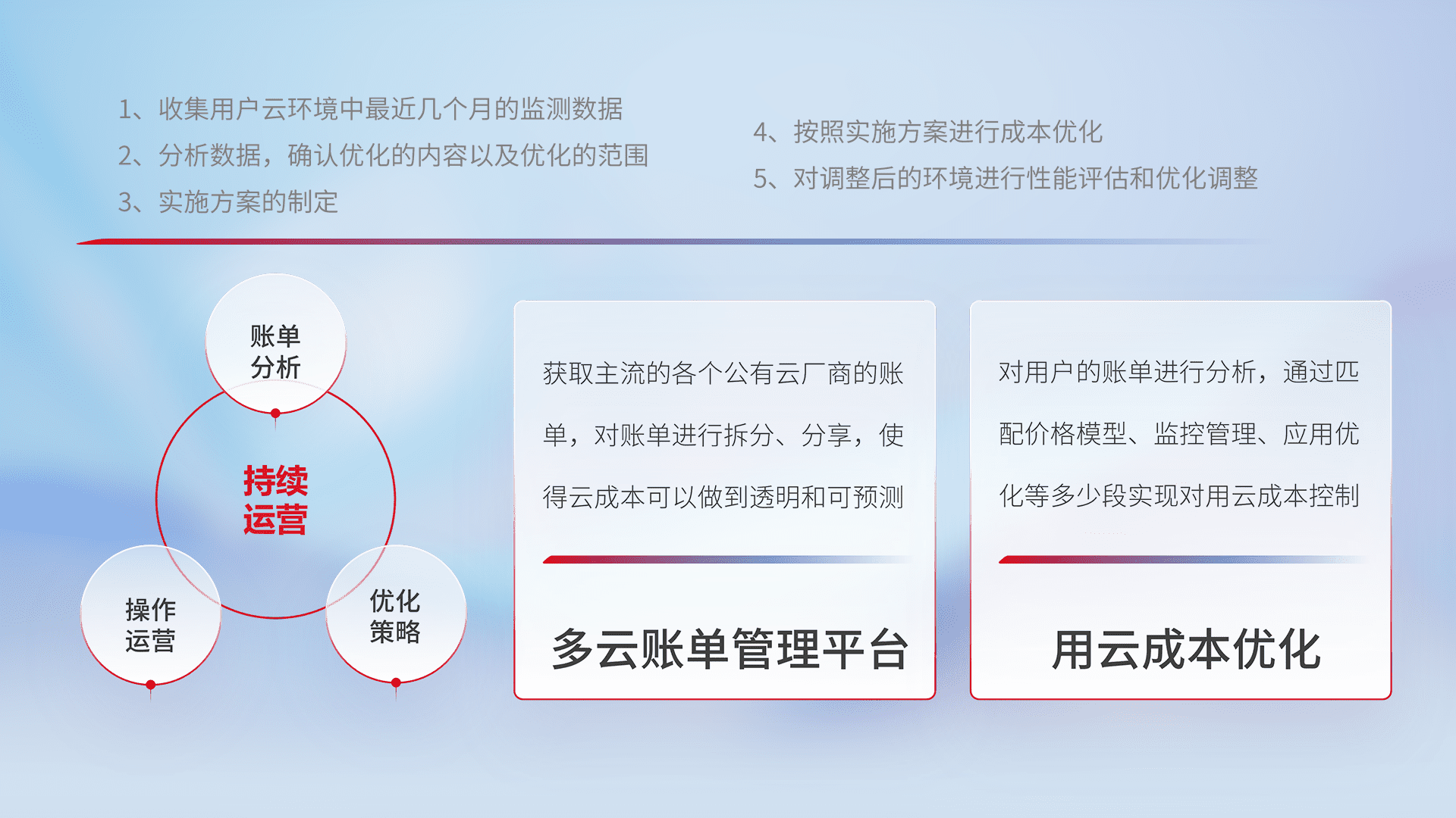 通过灵活运用多种自动化迁移工具,,,,帮助企业用户实现业务和数据高效 、、稳定的上云迁移和云上迁移,,,,采用自研多云纳管平台,,,,以中立管理模式,,解决多组织、、、多云、、多运维厂商的复杂关系的管理,,保证多云平台资源配置的一致性,,,,实时掌控云资源运行数据,,,,运用智能化工具分析云资源多云平台的管理服务,,,,透明化管理成本支出,,用云成本可预测、、用云费用可优化、、、云资源配额有据可依。。