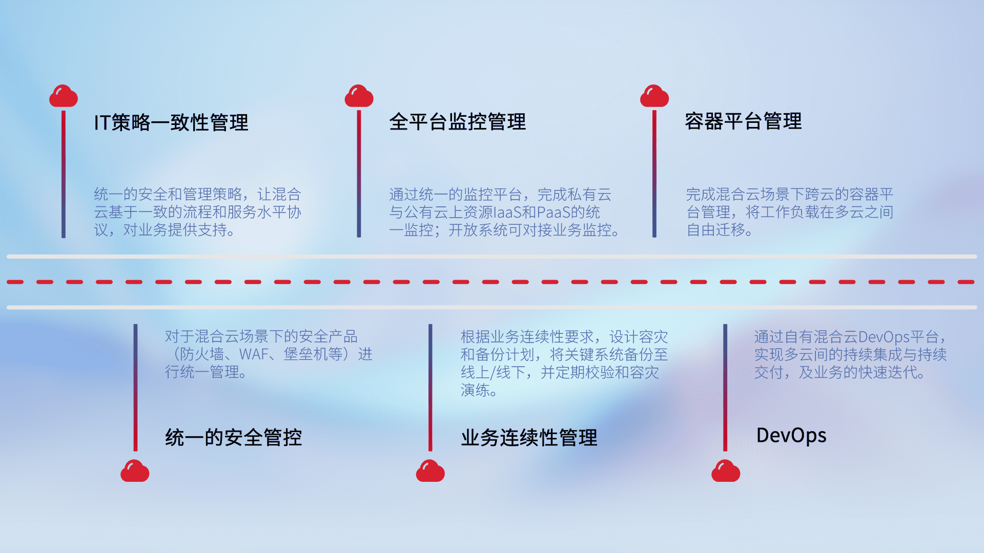 通过多云纳管,,以统一的资源数据模型把客户的云资源进行抽象和封装,,,进而实现对多云资源的统一操作,,,,保障云资源管理的可靠性、、、稳定性与可用性。。。量身定制化运维内容,,,配置、、、开发运维、、、补丁管理、、备份、、监控、、、、认证和访问管理、、、、审计和日常巡检等,,,,保障在用云过程中的可靠度,,,稳定度以及高可用率。。