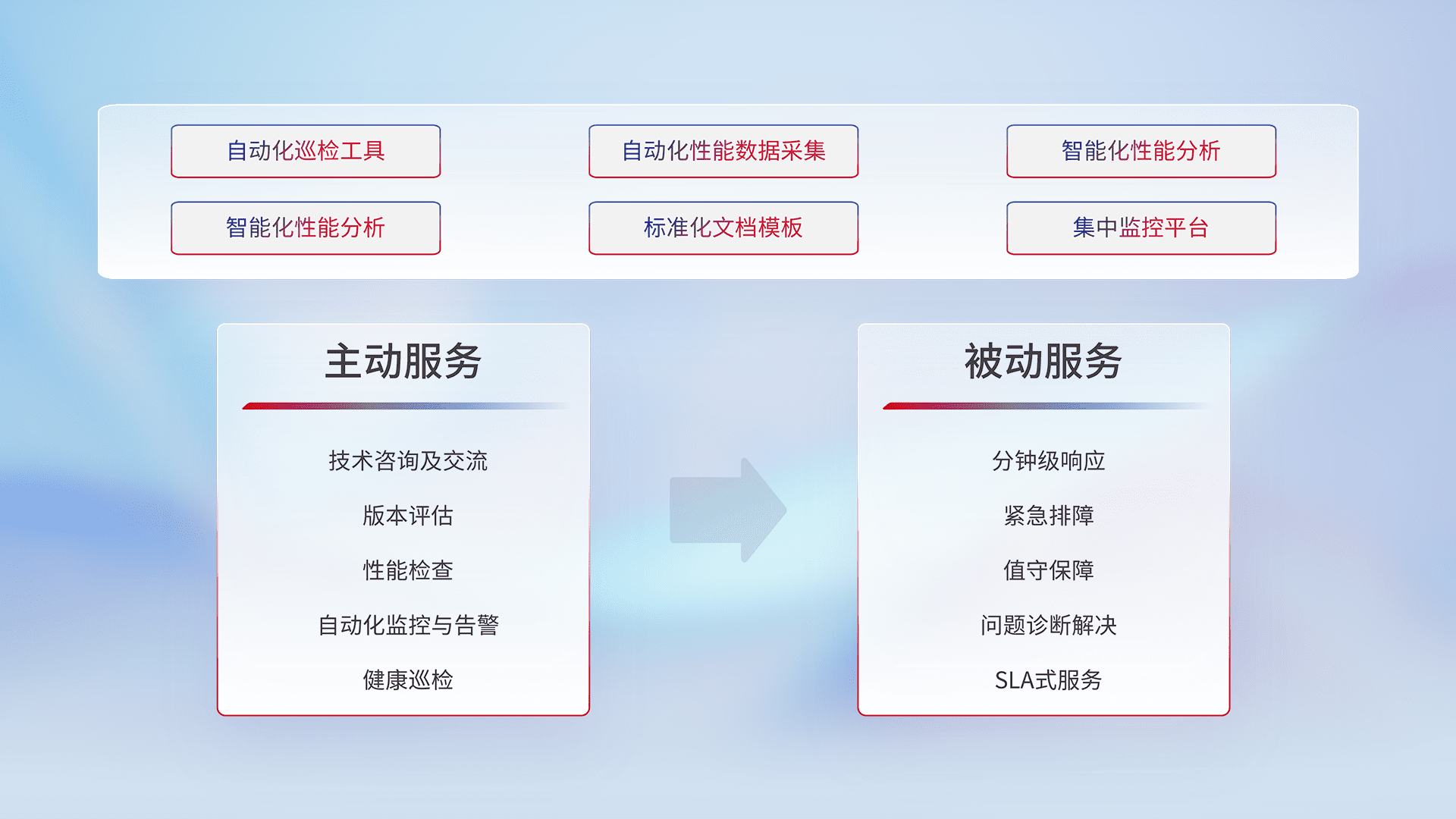 智能化工具和标准化文档,,,保障服务质量,,,,提供主动服务(包含技术咨询、、版本评估、、性能检查、、、、自动化监控与告警、、健康巡检)和被动服务包含(分钟级响应、、紧急排障、、值守保障、、问题诊断解决、、、、SLA服务)。。。。